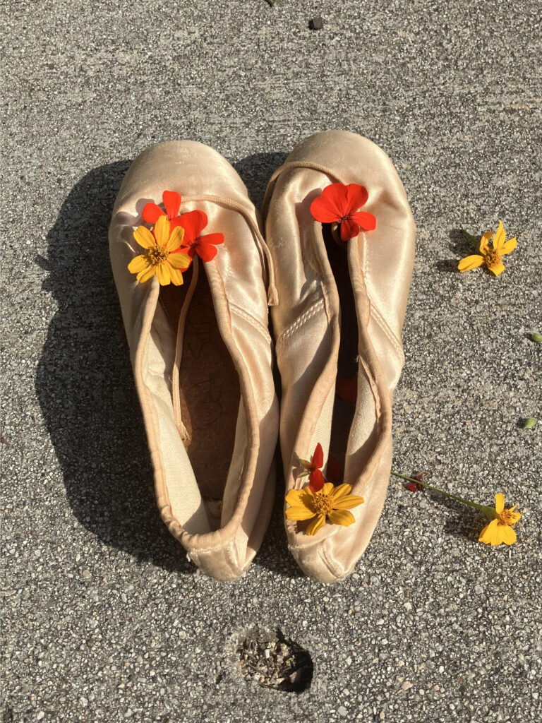 “I was inspired by my mom’s beautiful old pointe shoes, and I wanted to combine them with nature (flowers) and something hard or strong (concrete),” she says. “The idea of finding pointe shoes outside in the sun was magical for me.”