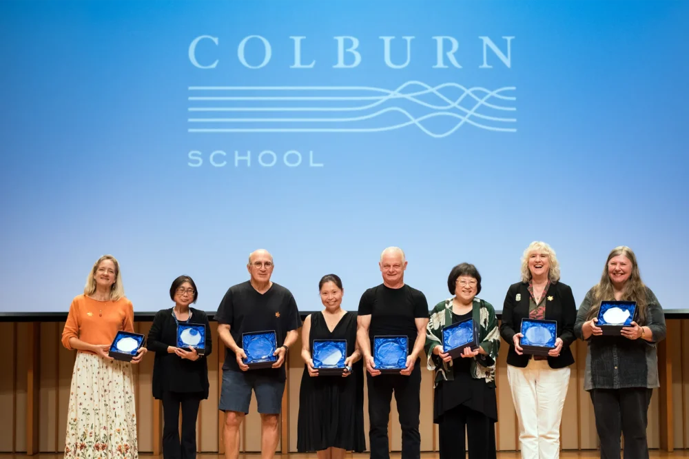 Faculty celebrating anniversaries of 20 years or more posed for a photo at Colburn’s Fall kickoff event for faculty and staff in September. Left to right: Leslie Carothers, Grace Huang, Jerry Kalaf, Carmina Glicklich, Kenton Youngstrom, Margaret Shimizu, Deb Devine, and Karen Lundgren. (Photo: Abby Mahler)